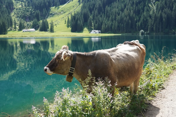 brown cow on green grass field near lake during daytime