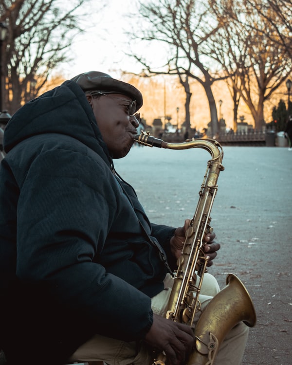 a man sitting on a bench playing a saxophone