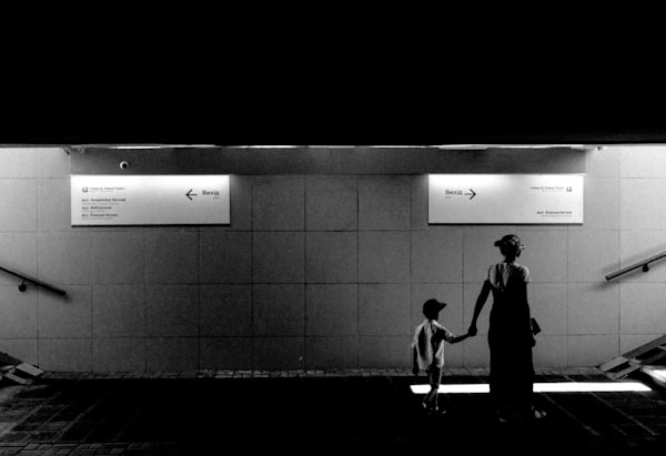 grayscale photo of man and woman walking on hallway