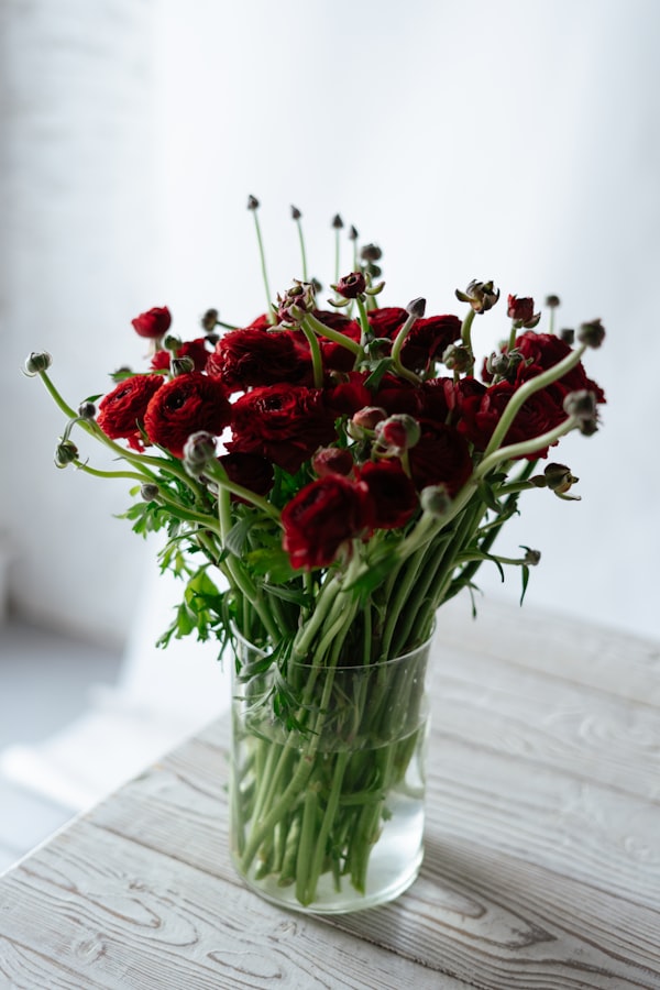 a vase filled with red flowers on top of a wooden table