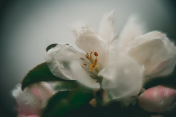 a close up of a white flower with green leaves