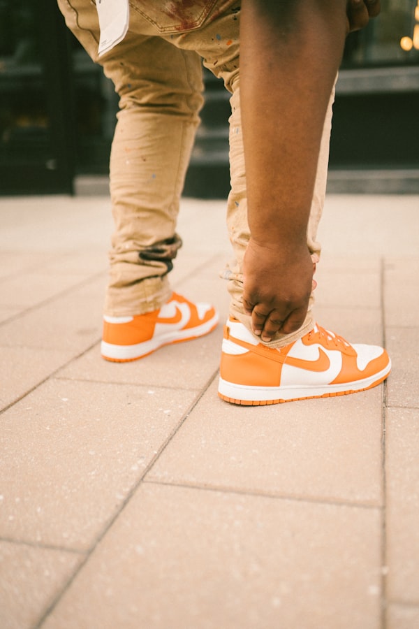 person in brown pants and white nike sneakers
